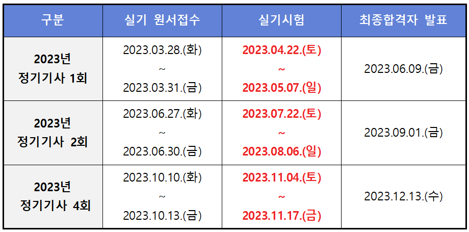 | 구분 | 실기 원서접수 | 실기시험 | 최종합격자 발표 |