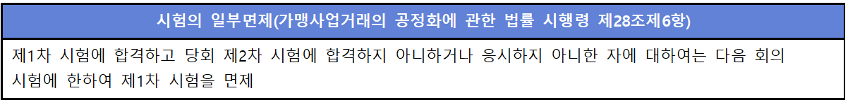 즉, 2024년도 가맹거래사 1차시험 합격 후 2차 불합격한 경우, 다음회인 2025 가맹거래사 1차 시험 면제, 바로 2차 실시 가능합니다.